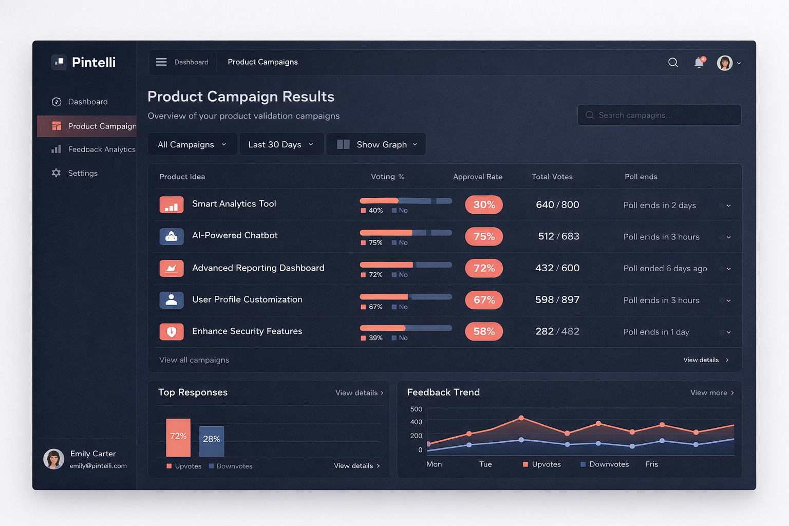Pintelli łączy walidację produktów ze zbieraniem ustrukturyzowanych opinii — wypuszczaj to, co wygrywa, bez zgadywania.